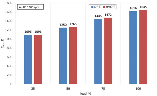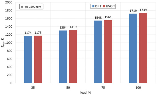Maximum temperature values of the working medium in the combustion chamber were determined at four loads and a constant engine crankshaft speed of 1600 rpm (B from ESC test).