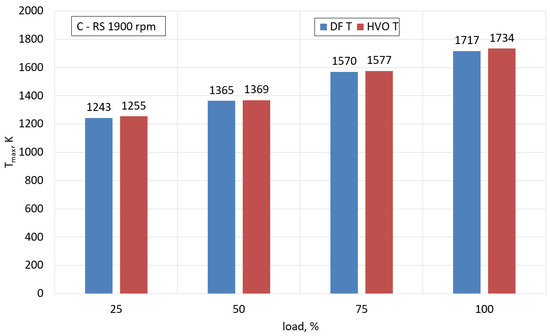 Maximum temperature values of the working medium in the combustion chamber were determined at four loads and a constant engine crankshaft speed of 1900 rpm (C from ESC test).