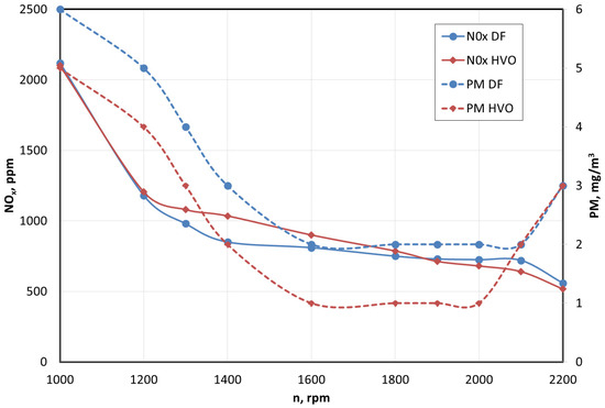 Speed characteristics. Concentration curves of nitrogen oxides and particulate matter are a function of engine crankshaft speed when feeding the engine with diesel fuel (DF) and hydrogenated vegetable oil (HVO).