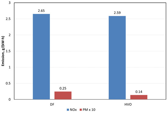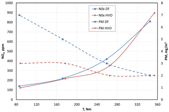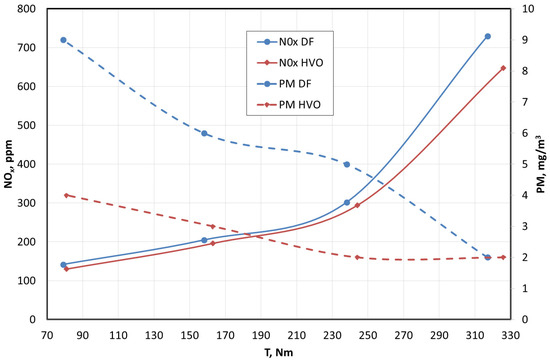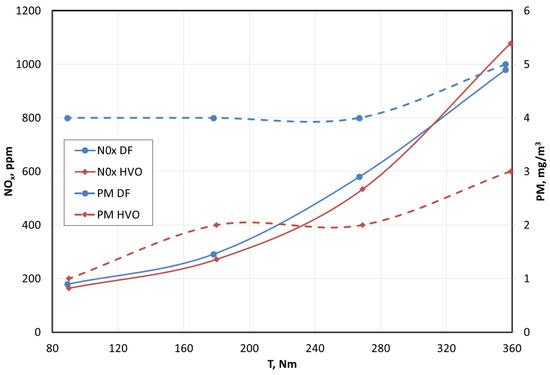 Load characteristics. Concentration curves of nitrogen oxides and particulate matter at a constant engine crankshaft speed of 1600 rpm and different torque values when the engine is fed with two fuels: diesel fuel (DF) and hydrogenated vegetable oil (HVO).