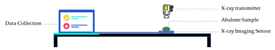The subsequent steps illustrate the process of X-ray image acquisition. First, a dried abalone sample was secured above the sensor. Subsequently, X-rays were emitted towards the sample through the X-ray transmitter. Following this, the signals sensed by the sensor were converted into X-ray images of the dried abalone using the accompanying software. Finally, by repeating these operations, a database of X-ray images was constructed for dried abalones.