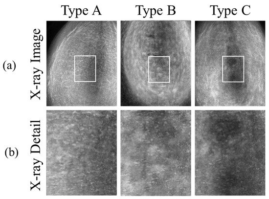 By analyzing the X-ray images of the dried abalone, we were able to roughly divide the images into three categories (Type A, Type B, and Type C), as shown in Figure 2, where Figure 2b is a zoomed-in view. For Type A X-ray images, the pixel values exhibited a more uniform distribution. For Type B, the distribution was less uniform than that of Type A due to noticeable white spots in the X-ray images. Type C X-ray images featured a prominent dark gray area in the center.