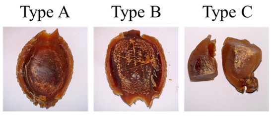 Through dissection, we found that the internal color of Type A dried abalone was uniform, the light transmission was good, and the number of white pitted spots were fewer. Type B displayed an uneven internal color, poor light transmission, and many white pitted areas. Type C muscle was different from normal muscle tissue; it had many cavities and cotton-like areas, and there was muscle tissue corruption in the cavity area.