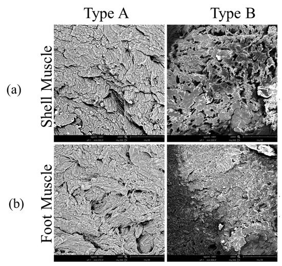 The muscle tissue structure of abalone primarily comprises collagen fibers and myofibrils, interwoven to create a dense network structure [22]. Figure 6 depicts electron microscope images of different muscles. In the Type A dried abalone, the myofibrils were slender and exhibited an intact and dense structure, with no apparent breakages. Conversely, Type B dried abalone fibers appeared relatively loose and disordered, with a larger space between the fibers. In general, the collagen content was positively correlated with the hardness, chewability, and resilience of the abalone [23]. A denser myofibrillar fiber structure corresponded to a lower collagen content, indicating a more favorable taste and internal quality of abalone.