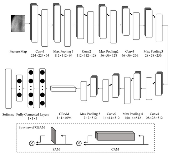 Figure 8 illustrates the optimized structure of the VGG-19+CBAM network in this paper, with the dimensions of the feature map outputted by each layer marked below the layer’s name. The size of the feature map in the database was 344 × 417 × 1, and the descriptions of the corresponding database operations are omitted here. The input feature map underwent several convolutional and maximum pooling layers, followed by processing through the CBAM module, three fully connected layers, before ultimately being fed into the Softmax for the final quality classification result. Note that the first convolutional layer, Conv1, resized the input image to a fixed size of 224 × 224 × 64. All max-pooling layers had a stride of two, and all convolutional layers were zero-padded with a stride of one. The final output size of the fully connected layer was 1 × 1 × 3, with the output of the first two layers being 1 × 1 × 4096.