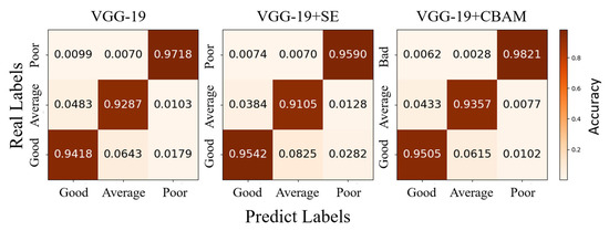 Consequently, by comparing the convergence speed of the loss value and accuracy among the three networks during training, VGG-19+CBAM demonstrated a faster convergence speed than VGG-19 and VGG-19+SE. Figure 9 depicts the confusion matrices of the testing set for VGG-19, VGG-19+CBAM, and VGG-19+SE. VGG-19 exhibited errors in two categories: low accuracy for “poor” samples, likely due to a small sample size causing an imbalance, and misrecognition errors between “good” and “average” samples, reflecting their fine-grained similarities.