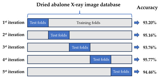 Furthermore, we employed five-fold cross-validation to assess the VGG-19+CBAM network, as shown in Figure 10. This procedure helps ensure the robustness of the model and reduces reliance on specific training sets, thereby enhancing the model’s predictive power on unseen data. By implementing cross-validation, we can more reliably evaluate the model’s effectiveness across different subsets of the data, providing a comprehensive understanding of its classification capabilities and generalizability. The results of the five-fold cross-validation indicated that the VGG-19+CBAM network exhibited varying levels of performance across different subsets of the dried abalone database, with stability being a concern. This inconsistency was primarily attributed to the insufficient number of samples, which led to performance discrepancies. In the future, we plan to augment the database with more samples to enhance the generalizability and stability of the VGG-19+CBAM network.