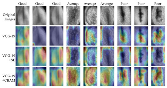 To compare the effects of the attention mechanisms and understand CBAM’s functionality, we used Grad-CAM with default values to visualize the results of the three networks, inserted after Conv5. Figure 11 illustrates the results of nine selected sample images, wherein increased redness indicates heightened attention. Compared with the other two networks, VGG-19+CBAM exhibited a broader range of network attention, focusing more precisely on characteristic areas. With CBAM, “poor” samples received increased attention at central positions, whereas SE paid less attention to these regions. The attention regions for “average” and “good” samples were significantly expanded, suggesting that the network extracted more information from the images.