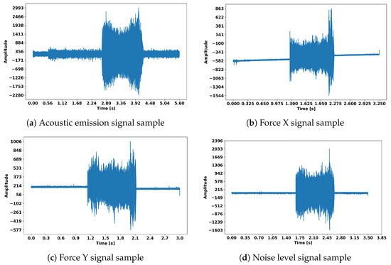 The composition of the dataset assembled during this phase is detailed in Table 1. A total of 75 samples were collected for the experiments, 25 for each of the represented classes. The number of samples was set at this level to make sure that each class would contain highly representative examples, outlining the signal characteristics for this specific label. Figure 3 illustrates sample raw signal plots for acoustic emission, X-axis force, Y-axis force, and noise levels.