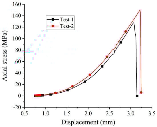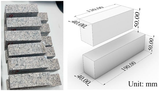 Granite is one of the common rocks in nature, which is involved in many kinds of engineering projects such as enhanced geothermal system (EGS), and it is also often used to study the characteristics of rock masses in shear processes such as stick–slip and seismic nucleation. Therefore, in this paper, granite is chosen as the research object, and its dimensions are shown in Figure 2, the upper brick is 130 × 40 × 50 mm3, and the lower is 190 × 40 × 50 mm3. The uniaxial loading curve of this granite material is shown in Figure 3, and the uniaxial compressive strength is approximately 140 MPa, and the elastic modulus is approximately 10 GPa. In this paper, it is proposed to carry out the direct shear test on granite flat fracture, and the shear device is the YZW100 rock direct shear apparatus of Central South University, as shown in Figure 4, and acoustic emission monitors are used to monitor the shear process. The upper and lower parts of the specimen are not set to the same size due to the space limitation of the apparatus. For the current specimen size, a shear surface of 13 × 4 cm2 can be allowed to slide 6 cm. In order to keep the initial state of the fracture surface consistent, all friction surfaces were obtained by sawing and polished, so that the initial flatness tolerance was controlled to within 10 μm. Some of the profiles are shown in Figure 5, where each scale of the longitudinal coordinates represents 0.01 mm.