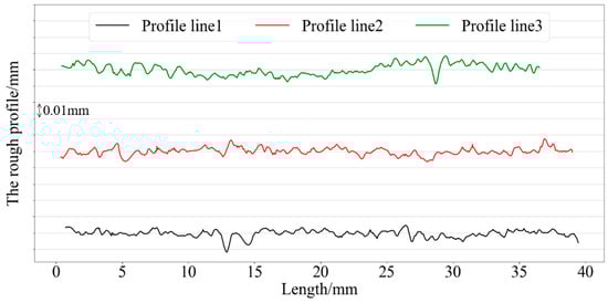 Roughness is measured in a variety of indicators, which are usually categorized into three types [22]: amplitude parameter, spacing parameter, and hybrid parameter, of which amplitude parameter is the most common. The amplitude parameter is mainly based on the vertical coordinate value of the surface. For two–dimensional profile lines, there are the following types of amplitude parameters. The arithmetic mean deviation of the profile, defined as Equation (1), indicates the average of the absolute value of the vertical coordinate value within the sample length, which can most directly reflect the degree of the friction surface being worn out, and is the sample length of the profile line.