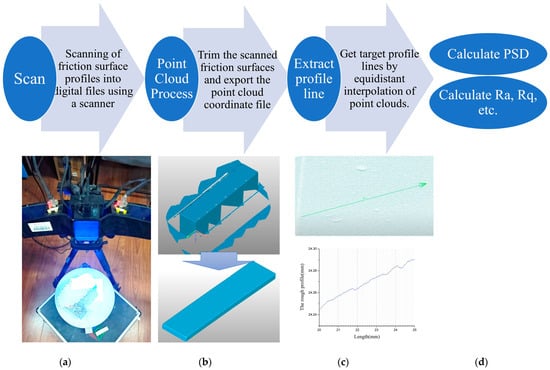 As in Figure 6, the data processing procedure is presented. The specimen is first scanned as a point cloud using a photographic 3D scanner, and then the target surface is trimmed from it. Since the point cloud data are three–dimensional and irregularly distributed, the profile lines often do not pass through the data points when extracting the profile lines. Therefore, a 3D linear interpolation algorithm is employed to obtain equidistant distribution of profile line data based on the scanned point cloud. Firstly, all the points are projected onto the xy plane. Next, for a sample point of the profile line, the three nearest projected points are found, ensuring that the sample point is inside the triangle formed by these three projection points. Then, the vertical coordinate of the sample point is calculated by using Barycentric Interpolation. Finally, based on the above profile line data, the corresponding roughness indicator values are calculated according to Equations (1), (2) and (7).