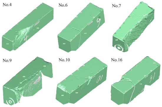 During the loading process, most of specimens that were under high normal force or low speed loading conditions experienced end shattering or side spalling at the first shear due to localized high stress at the end or side, as depicted in Figure 7. Therefore, these specimens were excluded from the roughness evolution analysis. The results of the remaining specimens were analyzed.