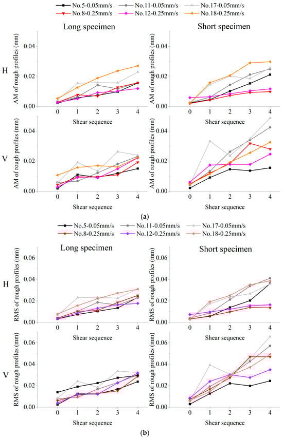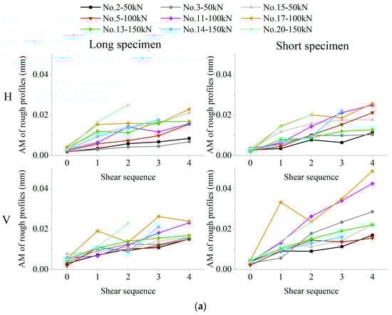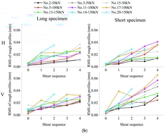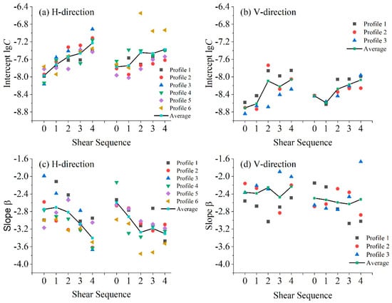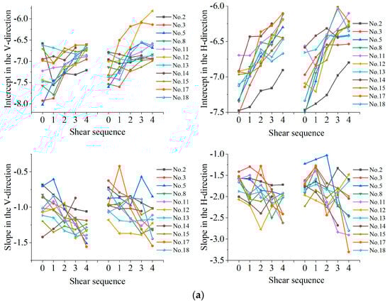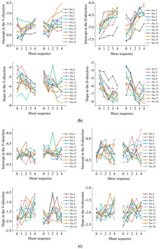 As can be seen in Figure 15, there is a clear difference between the trends of the fitted parameters corresponding to the different frequency bands. For the H direction perpendicular to the shear direction, the intercept in the high–frequency part does not change much, and the slope increases slightly but not significantly; while for the mid–frequency and the low–frequency part, most of the specimens show a significant increase in the intercept in both directions, while the slope decreases significantly. This clearly verifies the previous hypothesis that the changes in roughness during shearing are mainly concentrated in the relatively low–frequency part, which corresponds to the part with a spatial wavelength greater than 0.5 mm. That is to say, under the size of the specimens and the test conditions in this paper, in the direction perpendicular to the shear direction, the friction mainly creates “notches” with a width greater than 0.5 mm, which is the largest change in the whole profile. Smaller–scale asperity and microscopic contact did not change much during shearing. The amplitude of the roughness profile continued to increase over the limited number of shears (4) and shear distances (~320 mm) in this test, and showed no signs of weakening or stabilization.