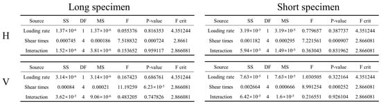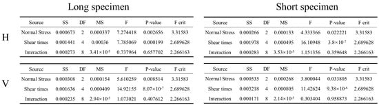As shown in Figure 8, the two plots show the results of the two variables, arithmetic mean value and root mean square of the roughness profile line for various normal force conditions (No. 2 represents specimen numbered 2). The data for each variable are further differentiated between the upper and lower specimens and different directions. Overall, the arithmetic mean and the root mean square of the roughness profile tend to increase as the shear slip increases. These phenomena indicate that the roughness profile is being continuously abraded and the morphology of the whole profile is continuously downward concave; on top of that, the continuous shearing also makes the complexity of the profile line increasing. Due to the inconsistency of the specimen lengths, the short specimens are always in friction. As can be seen from the comparison in the graphs, the mean and RMS values of the shorter specimens are generally larger, which further suggests that the slip results in the roughness of the flat fracture surfaces to become larger. Moreover, this phenomenon seems to have a certain correlation with normal force, particularly in the H direction. The greater the normal force, the more significant the changes in and . Next, taking the arithmetic mean as an example, a two-way repeated measures analysis of variance (ANOVA) is conducted. Here, the two factors refer to normal force and shear times. Prior to that, a normality test is performed on the data to ensure that the observed variables satisfy (approximately) the normal distribution, and a test of homogeneity of variances is also conducted. Finally, the ANOVA is completed in the “Data Analysis” module of Excel, and the results are presented in Figure 9, corresponding to the data in Figure 8a. As can be seen from Figure 9, regardless of the direction, the p-values corresponding to normal force and shear times are both less than 0.05. Therefore, it can be concluded that at a significance level of 0.05, normal force and shear times both have significant effects on roughness. Additionally, a comparison of the p-values indicates that the effect of shear times on roughness is more pronounced compared to normal force, and the interaction between the two factors does not have statistical significance.