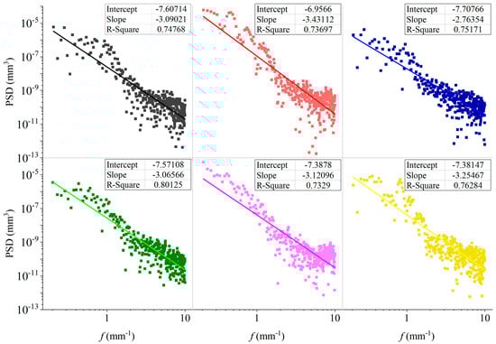 The PSD–f relationship of six profile lines perpendicular to the shear direction for a certain sheared friction surface, where the horizontal axis is the spatial frequency f and the vertical axis is the PSD, and they are all expressed in logarithmic form. The scatters represent the PSD values corresponding to different frequencies after the FFT, and the straight line is a linear fit to the scatters. The fitted slopes and intercepts are shown in the attached table.