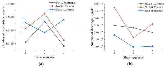 (a,b) Changes in the number of AE signals in the first three sets of shears under different loading rate conditions, including tension and shear types.