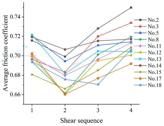 The change in roughness was accompanied by the change in the shear strength of the fracture surface during the test. As in Figure 18, the trend of the average friction coefficient in the sliding stage of several specimens is given. It can be seen that the average friction coefficient as a whole shows a pattern of decreasing and then increasing. For the change in roughness perpendicular to the shear direction, if it is correlated with the change in the friction coefficient, then it is logical that the average coefficient of friction should also increase with the increase in the normal force. However, according to Table 2 and Figure 18, no relationship between the average friction coefficient and the normal force can be found. For the roughness parallel to the shear direction, it does not change significantly with both normal force and loading rate, and increases with the number of shears. Compared with the initial ‘smooth’ flat fracture surface, the formation of ‘dents’ parallel to the shear direction reduces the contact area of the fracture surface, leading to a relative decrease in strength; however, as the ‘dents’ become deeper, the contact area gradually increases, leading to a continuous increase in shear strength. This statement reasonably explains the change in the average friction coefficient.