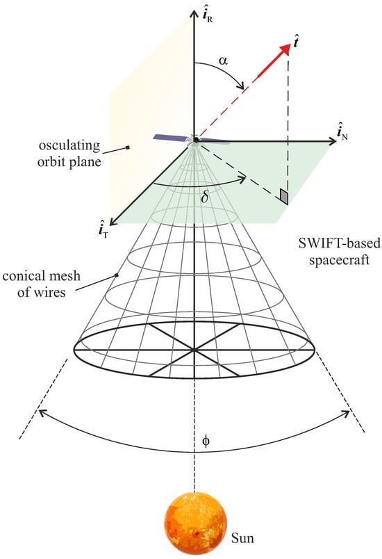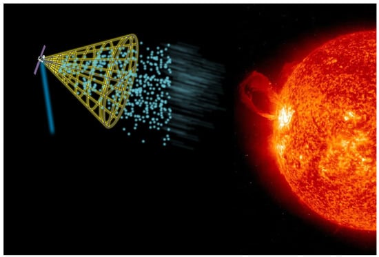 From a conceptual viewpoint, a SWIFT-based spacecraft uses the solar wind stream to produce a net thrust in the interplanetary space, as in the case of the E-sail propulsion system proposed by Dr. Janhunen two decades ago [,]. However, different from the more studied E-sail, a SWIFT propulsion system captures the solar wind charged particles through a large conical space structure formed by a mesh of conducting (thin) cables, which are maintained at a high positive electric potential, as sketched in Figure 1. The ion stream is then collected by a suitable spacecraft subsystem and accelerated out of the spacecraft in a manner that resembles the acceleration process of a classical ion electric thruster. Accordingly, a part of the SWIFT-induced thrust vector can be steered within a prescribed range without varying the axis direction of the mesh-formed conical structure. The latter, in fact, nominally remains aligned with the Sun–spacecraft line during the interplanetary flight, as indicated in Figure 1.