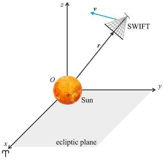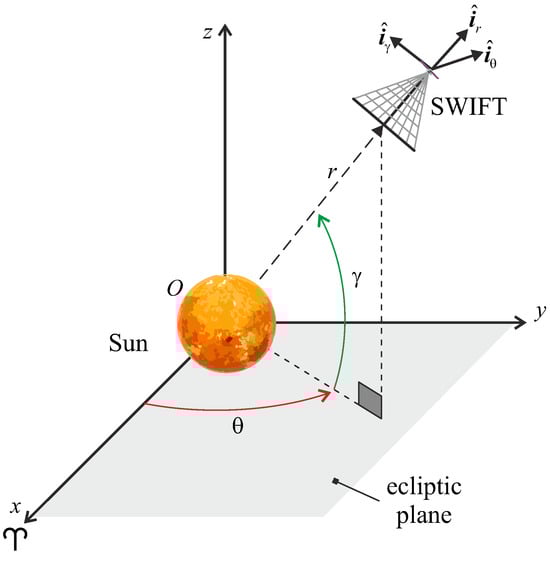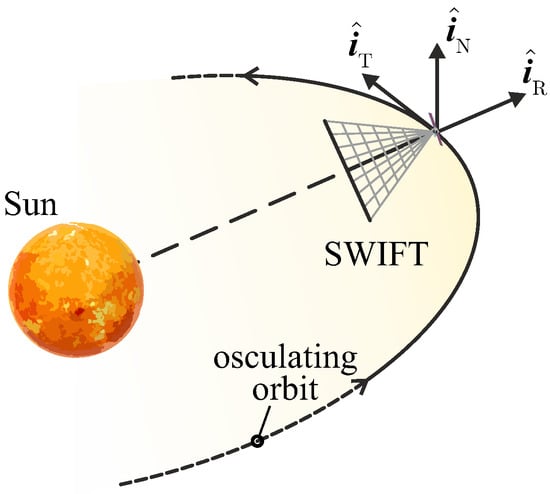 Accordingly, the heliocentric dynamics of the SWIFT-based spacecraft can be analyzed, as discussed in Ref. [], by using the classical set of EoMs in the polar reference frame of unit vectors