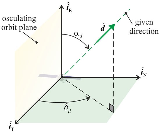 Consider a given direction in the RTN reference frame, which is indicated by the unit vector ; see the scheme of Figure 4. According to that figure, the unit vector is defined by the two angles and , which play the same role as the two control angles in the case of the unit vector ; compare Figure 4 with the sketch in Figure 3.