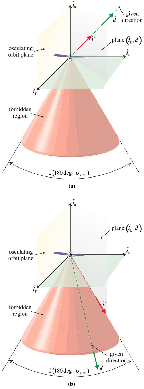Figure 3 also shows the aperture angle of the conical mesh of (thin) conducting wires of the SWIFT propulsion system. The latter conical structure should be considered a sort of geometric constraint on the direction of , because the stream of charged particles accelerated out of the spacecraft cannot be directed inside the (conical) mesh of wires. From a mathematical viewpoint, that constraint can be expressed through the following inequality: