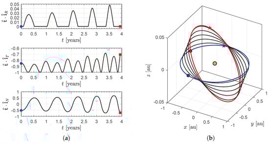 Results of the optimization process in a 3D Earth–Mars mission scenario when and . (a) Time variation of the components of in RTN. (b) Optimal transfer trajectory (black line). Blue line → is Earth’s orbit; red line → is Mars’ orbit; blue circle → is start point; red circle → is arrival point; blue star → is Earth’s perihelion; red star → is Mars’ perihelion; orange circle → is the Sun.
