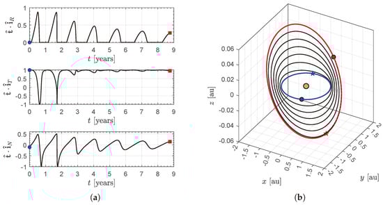 In the case of an Earth–Venus orbit-to-orbit 3D transfer, the solution of the optimization problem gives a minimum flight time of about ( with respect to the value obtained in a rapid 2D circle-to-circle transfer []). The time variation of the components of the control unit vector in the RTN reference frame and the optimal transfer trajectory in the Cartesian heliocentric ecliptic reference frame are reported in Figure 8. In particular, the scale of the z axis in Figure 8b is different from that of the other two axes to highlight the three-dimensionality of the transfer.