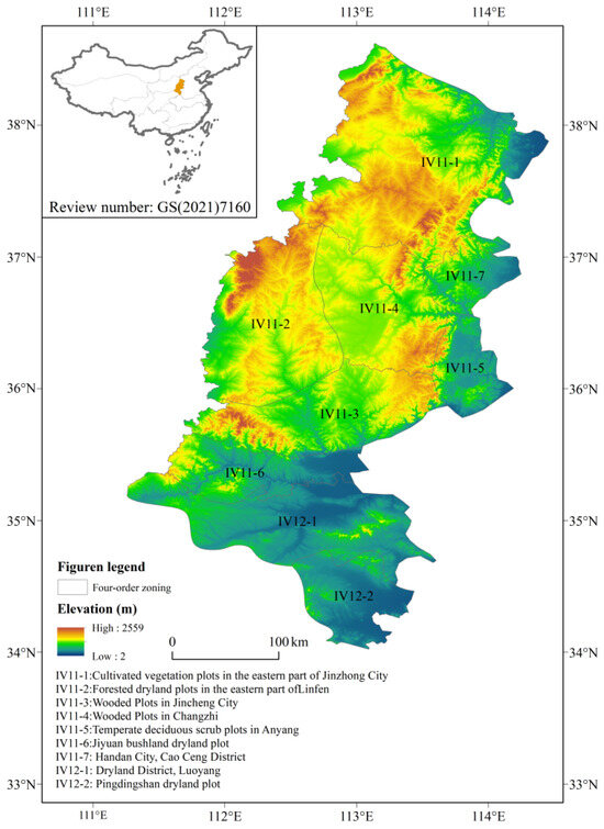 The area of research is the warm temperate forest and farming subregion in the northeast of the Loess Plateau (hereinafter referred to as the forest and farming subregion of Loess Plateau), one of the secondary national natural resource zones studied [25,26] (Figure 1). The research zone is situated in the Loess Plateau’s eastern region, geographically between 30° N and 40° N and 110° E and 120° E. It has four distinct seasons and a continental monsoon climate. Winters are chilly and dry, while autumns are moderate and cool, and summers are hot and rainy. The average annual temperature from south to north is 10.5~16.7 °C. Everywhere, the annual precipitation is between 350 and 1230 mm, with an uneven seasonal distribution. Additionally, 60% of the yearly rainfall occurs from June to August, when precipitation is relatively concentrated. The study region’s interior is undulating, with longitudinal river valleys and a landscape consisting of mountains, hills, platforms, and plains. The world’s thickest loess cover is found in the Loess Plateau area. The loess layer has an average thickness of 50–100 m and a maximum thickness of over 300 m, and it declines in thickness from northwest to southeast. Loess, black clay, brown clay, and other soil types are available; 50% of the weight of loess is made up of powdery grains, which are loose and porous, easily loosened by water, and vulnerable to erosion from runoff and rainfall. The study area covers 81,735 km2, which includes two three-order zones, a dry-land area in the northern Loess Plateau and forested dry-land area in the northern Loess Plateau, and nine four-order zones, including dry-land plots in Luoyang City (IV12-1), dry-land plots in Pingdingshan City (IV12-2), cultivated vegetation plots in the eastern part of Jinzhong City (IV11-1), forested dry land plots in the eastern part of Linfen (IV11-2), wooded plots in Jincheng City (IV11-3), wooded plots in Changzhi (IV11-4), temperate deciduous scrub plots in Anyang (IV11-5), Jiyuan bush land dry land plots (IV11-6), and Handan City, Cao Ceng District (IV11-7) [27,28,29].