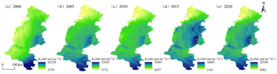 Temporal and spatial distribution of rainfall erosivity factors in the research region from 2000 to 2020.