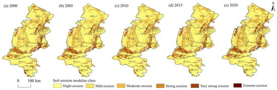 Distribution of soil erosion severity across space in the research region in (a) 2000; (b) 2005; (c) 2010; (d) 2015; (e) 2020.