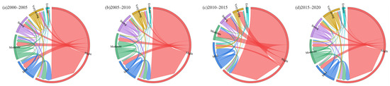 Soil erosion area share-transfer matrix chord diagram for the study area from 2000 to 2020: (a) 2000 to 2005; (b) from 2005 to 2010; (c) from 2010 to 2015; (d) from 2015 to 2020.
