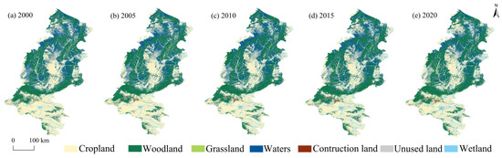 Different land use spatial distributions on the forest farming subregion of Loess Plateau from 2000 to 2020. (a) The year 2000; (b) the year 2005; (c) the year 2010; (d) the year 2015; (e) the year 2020.