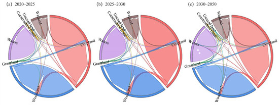 Land usage projections for the years 2025, 2030, and 2050 are based on the PLUS model, using 2020 as the starting point. From the outcomes, a chord diagram of the land use change transfer matrix between 2020 and 2050 was created (Figure 7). Land use continues the trend from 2000 until 2020, with cropland, woodland, and grassland decreasing by 2554.0, 670.6, and 82.2 km2, respectively, and construction land, waters, and wetland increasing by 20.7, 467.0, and 2818.6 km2, respectively. The main change is the conversion of cropland to construction land, followed by the transformation of woodland, water areas, etc., to construction land and unused land. Cropland has decreased in size while other land uses have increased, which verified that the urbanization procedure expanded with the constant enhancement of social and economic levels. This trend in land use change also shows that decisions to return cropland to grassland, woodland, and water were implemented successfully in order to suit the demands of urban development and the surrounding ecosystem.