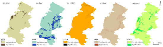 Results of the risk detector. The non-high-risk areas are those where: (a) the terrain elevation is between 1595 and 2559 m; (b) the rainfall is between 808 and 854 mm; (c) the LUCC is grassland; (d) the slope is greater than 35 degrees; and (e) the NDVI ranges between 0.9 and 1.
