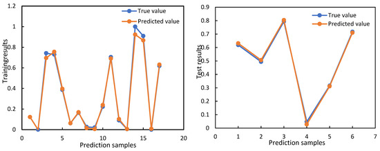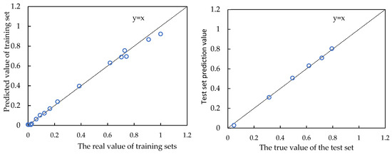 From the figure, we can see that in the predicted value image of the training set and the prediction set, in the fitting relationship between the scatter points of the predicted value and the real value of the training set, and the prediction set and the linear fitting line, we can compare and observe that the fitting effect of the training set and the test set is very significant and the scatter points are in or very close to the linear fitting line, which indicates that the model is very accurate in the prediction results of the training set.