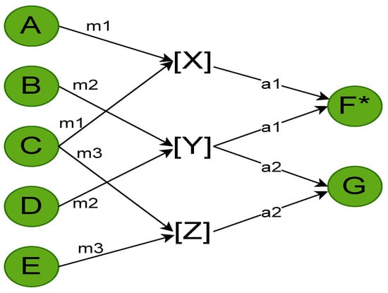 A more detailed model of the system is composed of two functional layers. The first one contains three multipliers, namely , , and , receiving the input signals, namely A, B, C, D, and E. The second layer is composed of two adders, namely and , producing the output values of F and G. Only inputs (of the first layer) and outputs (of the second layer) of the system are directly observable. The intermediate variables, namely X, Y, and Z, are hidden and normally cannot be observed.
