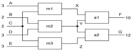 Let us briefly recapitulate a classical example from the artificial intelligence domain applied to diagnostic reasoning. This example is based on analysis of the behavior of a multiplier–adder circuit; it was presented and analyzed in a seminal paper by R. Reiter []. It has also been widely explored in a number of AI diagnostic readings, analyses, and investigations, such as [], as well as some of the second author’s papers, including [,,].