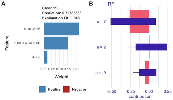 For the learned RF model, we applied the most popular XAI tools, namely LIME and SHAP. The results for representative prediction are presented in Figure 3 below.