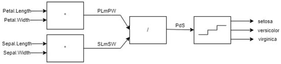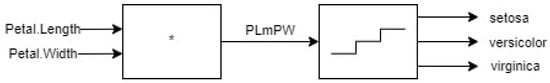 This kind of model, containing functional blocks as components, as well as specification of intermediate variables and component connections, is the intuitive model we aim to use for almost any kind of explanatory reasoning. Such a model can be used for output prediction, abductive reasoning for finding possible inputs and generating the observed output, and even for complex diagnostic reasoning [,]. Such a case is considered below. The aim is to show the potential of using such models.