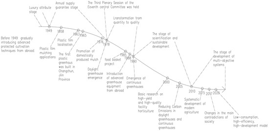 China’s greenhouse development started late, and over the course of time, its greenhouse development experienced three stages (Figure 1). The first stage began in the 1960s with the gradual emergence of agricultural greenhouses in China, which were structurally simple, single-function plastic greenhouses; the second stage began during the 1970s following the “Eleventh Plenary Session of the Third Plenary Session of the Third Central Committee”. In the second stage in the 1970s, the greenhouse sector in China received special attention, and the area of greenhouses grew considerably, with the first solar greenhouses (also named solarium) beginning to appear. In the third stage, the 1990s to the present, the continuous efforts of China’s researchers, combined with advanced greenhouse control equipment from abroad and the introduction of advanced crop production technologies, resulted in further modernization of China’s greenhouse structure and crop production quality and also increased productivity. Today, with the introduction of the “double carbon” policy, today’s greenhouses are moving in low-energy-consumption, high-efficiency, and high-yield directions.