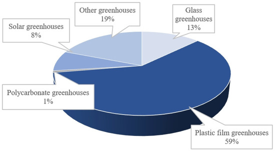 In recent decades, China’s greenhouses have been developing steadily, and the greenhouse area in China now ranks first in the world, accounting for a large proportion of the area used for fruit and vegetable cultivation. Greenhouses play an important role in improving the utilization rate of agricultural resources and the yield and quality of agricultural products. In 2023, the cumulative total area of new greenhouses in the country was 1835.87 ha, of which the area of new plastic film greenhouses was 1094.1 ha, accounting for about 60% of the total, the area of glass greenhouses was 234.32 ha, the area of polycarbonate greenhouses was 12.48 ha, the area of solar greenhouses was144.17 ha, and other types of greenhouses (landscape greenhouses, greenhouse restaurants, etc.) make up 350.8 ha (Figure 2) [4].