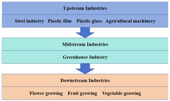 The structure of China’s greenhouse industry chain is relatively straightforward, mainly composed of the upstream industry, the midstream industry, and the downstream industry (Figure 4).