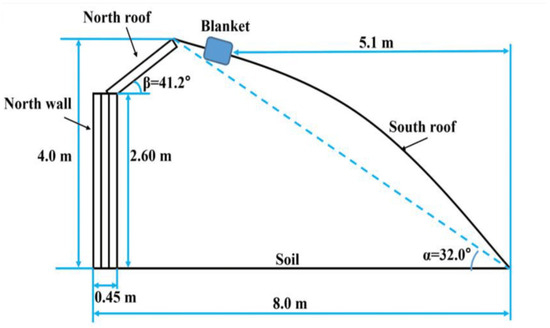 The cold winter weather in northern China has hampered the development of Chinese agriculture, and in order to solve this problem, China has designed and introduced a unique facility: the solar greenhouse. Solar greenhouses (Figure 6) are agricultural facilities built using simple but durable materials, consisting of three main parts: the south (transparent) roof, the north roof, and the north wall. The south roof is made of a transparent material (plastic film), the north roof is made of an opaque thermal-insulating material, and movable thermal blankets are placed on the outside of the south roof, which are unfolded at night on the north roof and laid on top of the south roof for thermal insulation. The north wall is made of a passive solar energy storage system [14]. In most commercial solar greenhouses, there is no heating equipment; the north wall and the thermal blankets maintain an adequate level of indoor air temperature to meet the needs of growing vegetable crops. Figure 7 shows the structural sections of a solar greenhouse [15]; the thickness of the north wall base is 0.4–8 m, according to the demand, and the height of the north wall is mostly in the range of 2–4 m. The span of solar greenhouses (north to south length) is 7–12 m. Larger spans improve the efficiency of solar energy utilization and expand the space available for production.