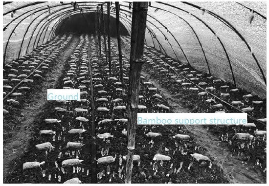 During China’s first phase of greenhouse development in the 1960s, simple bamboo-frame plastic-covered greenhouses were introduced (Figure 8), which were low-cost, easy to build and dismantle, and effectively controlled pests and diseases while also handling soil problems [22]. However, their service life is short, they introduce maintenance problems, and the internal available width of these greenhouses is small. These simple bamboo-frame plastic greenhouses have very low costs of about CNY 5–8 per square meter, which were initially suitable in rural areas for low-income farmers.