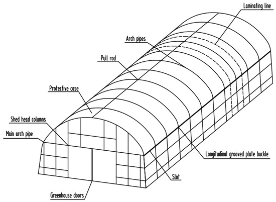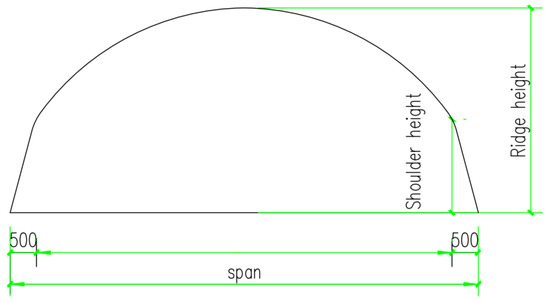 The advantages of steel-frame greenhouses over simple bamboo-frame greenhouses have made them the most popular type of horticultural facility in China. Figure 10 shows a cross-section of a steel-frame greenhouse, which may have variable span widths of 8, 10, 12, and 14 m, a shed edge of 0.5 m, with a height of 1.5 m. Other dimensions are shown in Table 1.