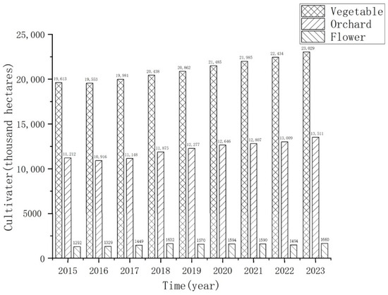 With the improvement of agricultural production techniques and technology, China’s facility-based agriculture has made significant breakthroughs in terms of horticultural production relating to vegetables, fruits and melons, flowers and seedlings, and the growth of greenhouses and relevant equipment has progressed rapidly. In recent years, China’s vegetable, orchards, and flower planting area has shown a year-to-year rising trend, which is associated with the county’s economic development and improved national income; however, at the same time, the demand for these products has increased. It can be seen in Figure 12 [25,26,27] that in the period of 2015 to 2023, the sown area of vegetables grew from 19,613,000 ha in 2015 to 23,029,000 ha in 2023, and the cultivation area of orchards and flowers also rose considerably.