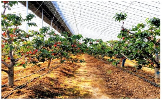 The facility cultivation of fruit trees (Figure 13) [28] refers to improving or controlling the environment in a facility with the help of greenhouse structures, rain shelters, and other protective facilities based on making full use of local natural resources in seasons that are not suitable for the growth and development of fruit trees [29]. Environmental factors, such as light, temperature, humidity, and CO2 concentration, that provide suitable conditions for the growth of fruit trees are artificially regulated, and the adjusted cultivation techniques help to achieve production goals in this highly capital-, labor- and technology-intensive industry. As a new production technique, the protected cultivation of fruit trees is an important means of achieving high-quality development in the fruit industry in China, and it has great practical significance, expanding the cultivation area of excellent varieties, extending the supply period of fresh fruits, and achieving annual supply while preventing natural disasters and controlling pests and diseases, thus producing safe, high-quality, high-end fruits, improving production efficiency, and increasing the economic and social benefits of the sector [30]. Tree species mainly include northern fruits, such as grapes, peaches, cherries, plums, and apricots, as well as southern fruits, such as citrus fruits, dragon fruit, lotus root, guava, and papaya. The protected cultivation of fruit trees has become one of the pillar industries for poverty alleviation and rural revitalization in many areas in China.