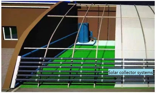 Hu et al. [40] developed and analyzed an active solar heating system (ASHS) consisting of five solar water heaters equipped with vacuum tube solar collectors, a hot water storage tank, and a heating system that included a booster pump and heating tubes. During the day, water is heated in the solar collectors and stored in the tank, which is then circulated into the heating tubes to distribute heat to the aerial and root environment of the plants. The results of the study showed that the ASHS was successful in providing 76% of the annual heating demand, heating the solar greenhouse for four months and keeping the temperature inside the greenhouse above 8 °C at night.
