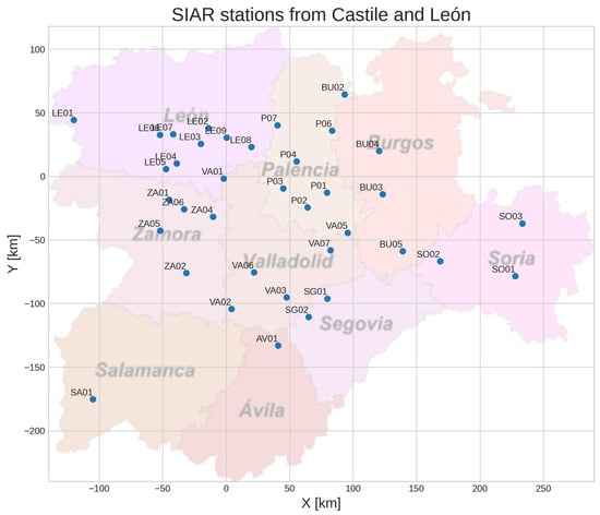 CyL-GHI dataset: global horizontal irradiance dataset from the region Castile and León in Spain. Source: “Figure 4. Distribution of the 37 stations selected for the CyL-GHI dataset after the exploratory data analysis process.” by Benavides et al. [25], licensed under Creative Commons Attribution 4.0 License.